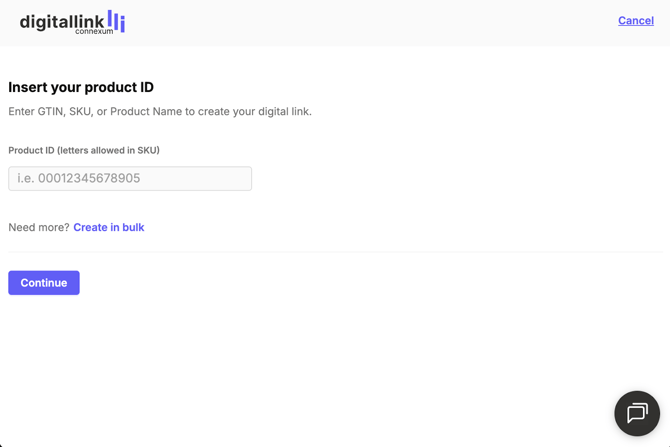 On the Digital Link creation screen, click Create in bulk. This option is designed for generating multiple Digital Links at the same time.