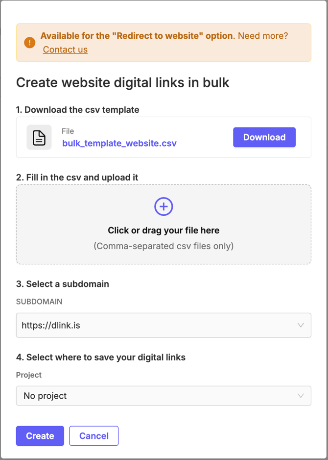 If you need to create multiple Digital Links at once, the Bulk Create option allows you to generate them quickly using a CSV file. Follow the steps below to create your Digital Links in bulk.